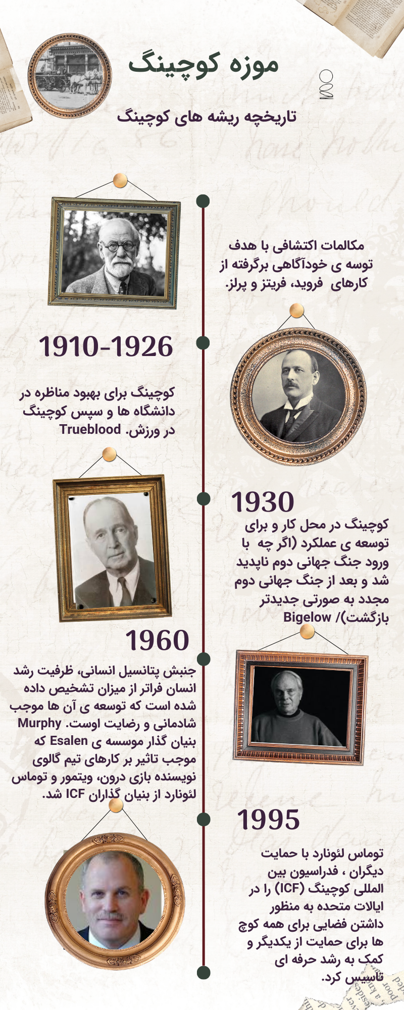 از لحاظ تاریخی، کوچینگ ریشه در منابع و و فرهنگ های مختلف دارد، از ورزش گرفته تا تجارت، روانشناسی و حتی فلسفه های باستانی و روند تکامل آن منعکس کننده درک عمیق رفتار انسان، فرآیندهای یادگیری و پتانسیل ذاتی برای رشد اوست. خاستگاه کوچینگ امروز را می توان به اواخر قرن بیستم نسبت داد که زیربنای فلسفی آن بازتاب روش سقراطی  و رویکرد انسان گرایانه به رشد شخصی است.عکس زیر نگاهی کلی به ریشه های کوچینگ  در طول زمان است که تاریخچه ی آن از کتاب راهنمای جامع کوچینگ جاناتان پاسمور گرفته شده است.
