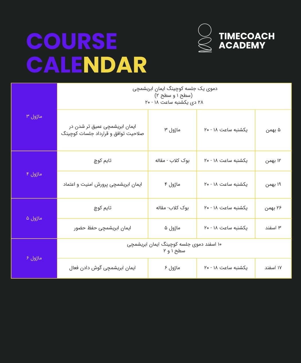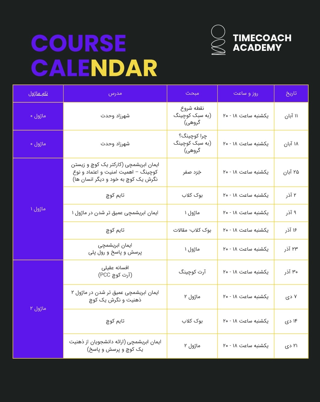 • ارزش های تایم کوچ بر مبنای علمی بودن و به روز بودن در سطح جهانی جلو میره. شما استانداردهای کوچینگ 2025 رو در سطح کوچ های جهانی دریافت میکنید. (رزومه مدرس اصلی ایمان ابریشمچی)